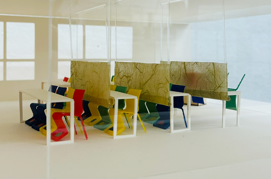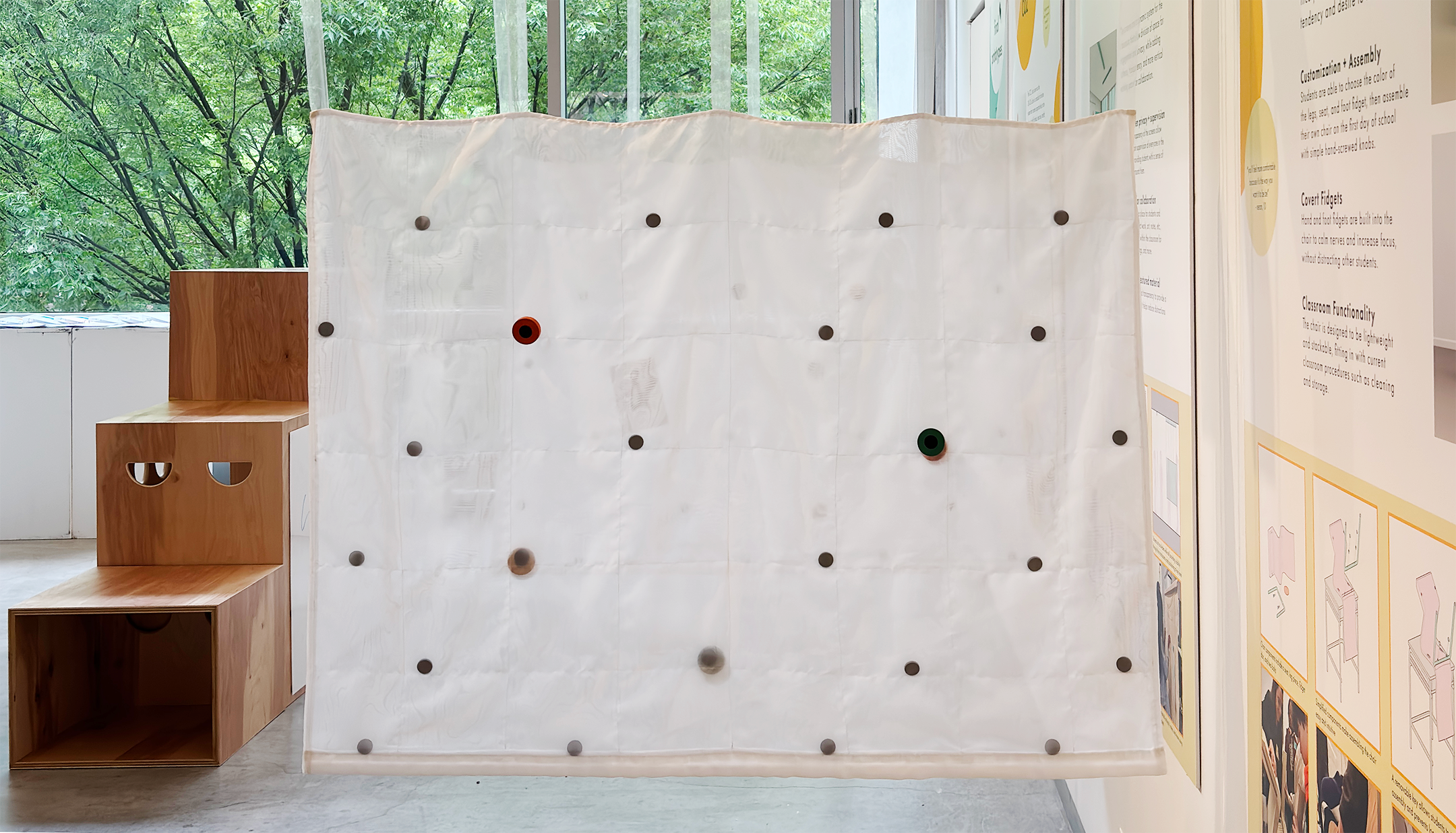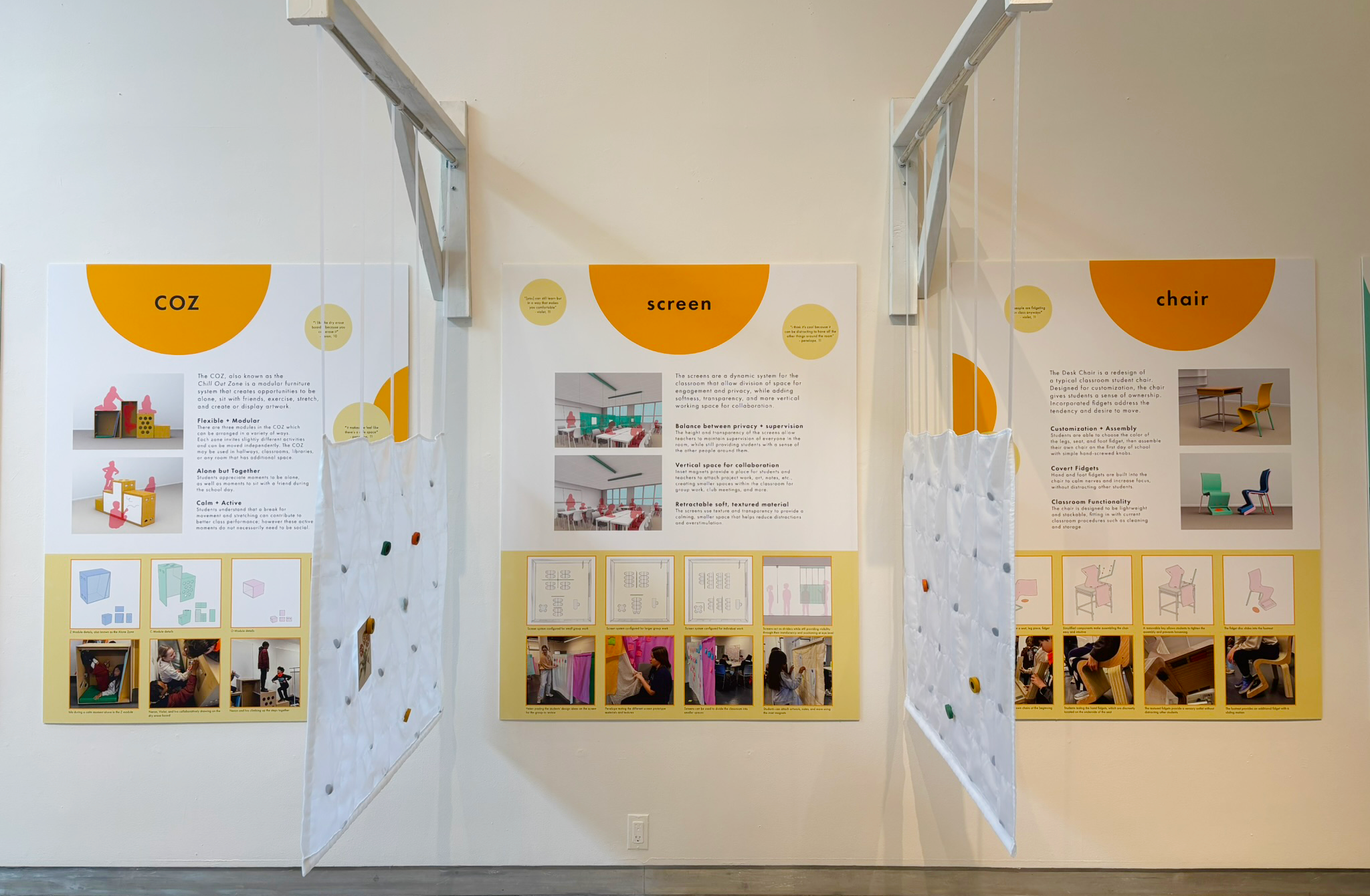 The floating partition system is a dynamic element for the classroom that allows division of space for engagement or privacy, while adding softness, transparency, and more vertical working space for collaboration.